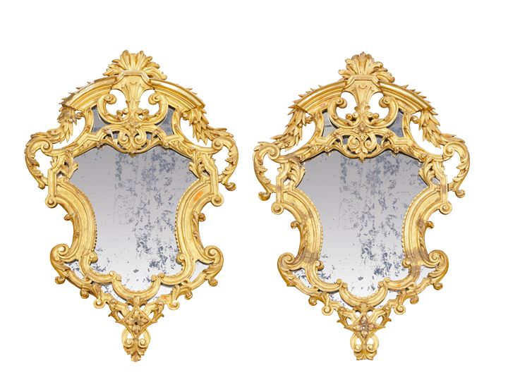 Lotto 526 | COPPIA DI SPECCHIERE Coppia di specchiere di gusto barocco, in legno scolpito...