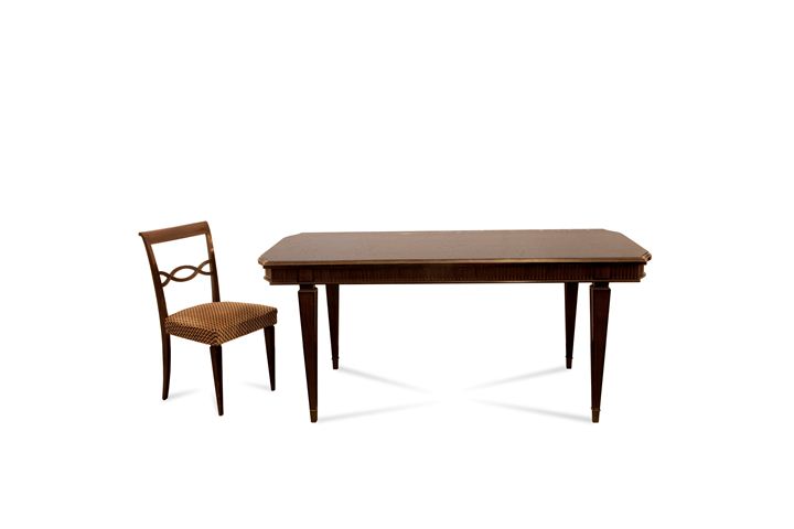 TAVOLO E SEI SEDIE Tavolo e sei sedie in mogano di gusto inglese, epoca XX...