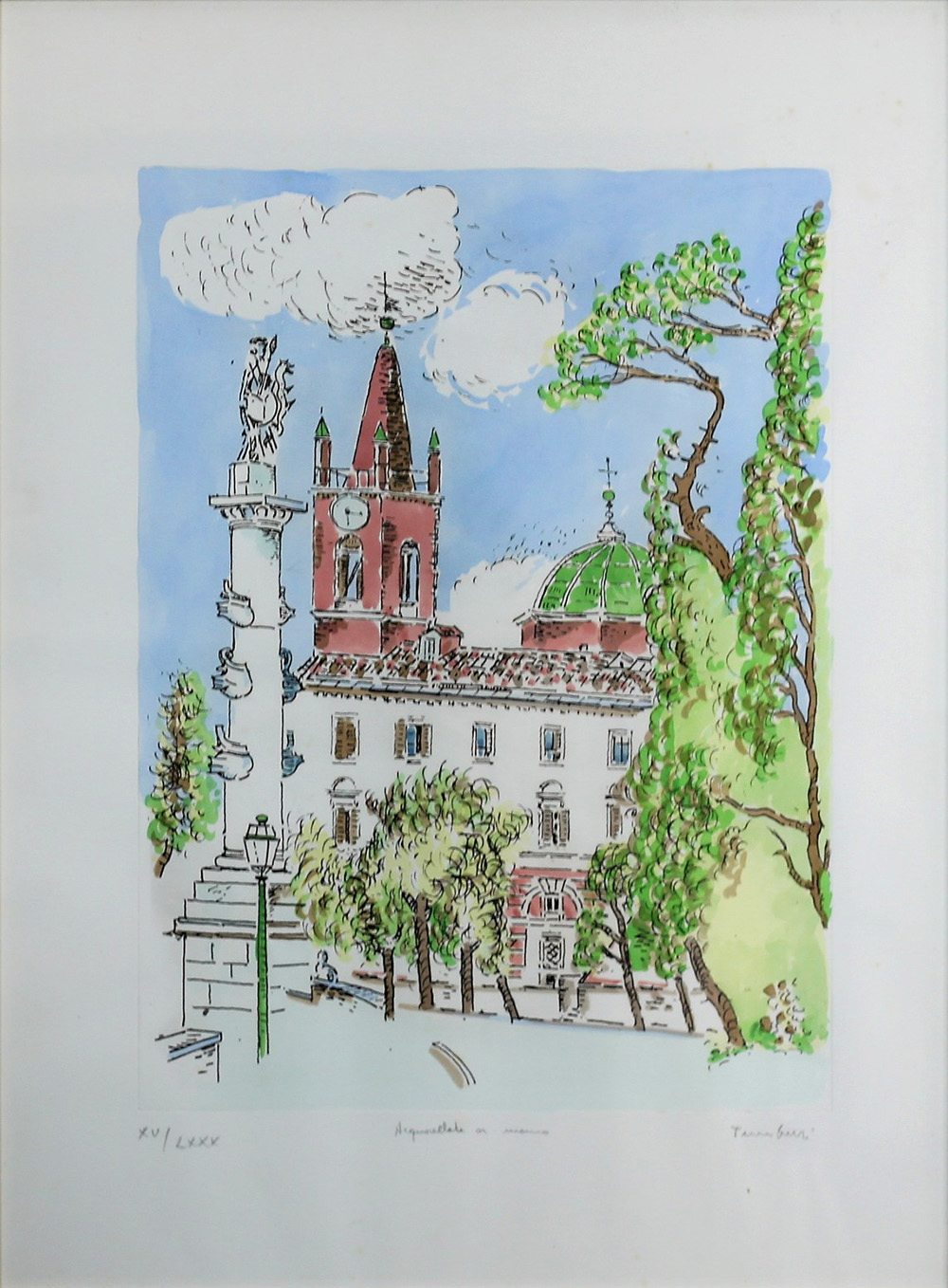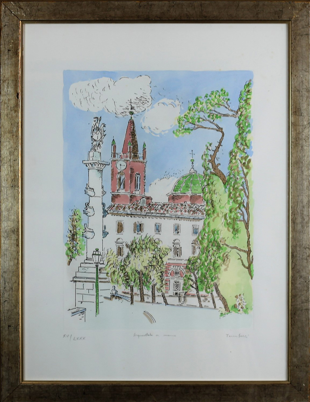 TAMBURI ORFEO (JESI 1910 PARIGI 1994), Cattedrale, Litografia acquarellata a mano Anni 80 Dim. 75x55 Esemplare XV/LXXX Tiratura in basso a sx Scritta "Acquarellata a mano" in basso al centro Firmato in basso a dx