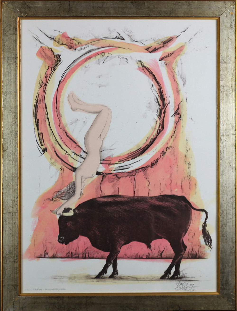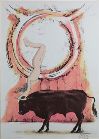 QUARTO ANDREA (LUCCA 1959), Segno zodiacale il toro, Litografia acquerellata a mano Anni 80 Dim. 70x50 Esemplare unico Firmato in basso a dx
