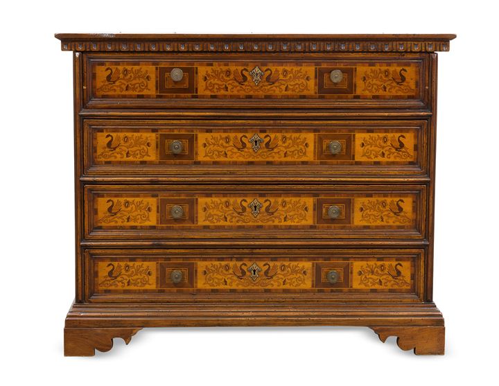 CASSETTONE Vecchio cassettone a ribalta in noce, intarsiato con essenze...