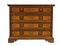Vecchio cassettone a ribalta in noce, intarsiato con essenze pregiate; fronte a tre cassetti e calatoia