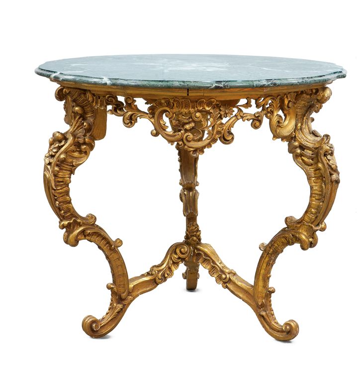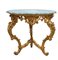 Tavolo rotondo in legno scolpito e dorato, tre gambe mosse, piano in marmo verde