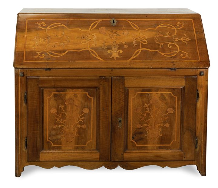 Mobile a ribalta in noce intarsiato in acero a motivi floreali, fronte con calatoia celante quattro tiretti