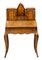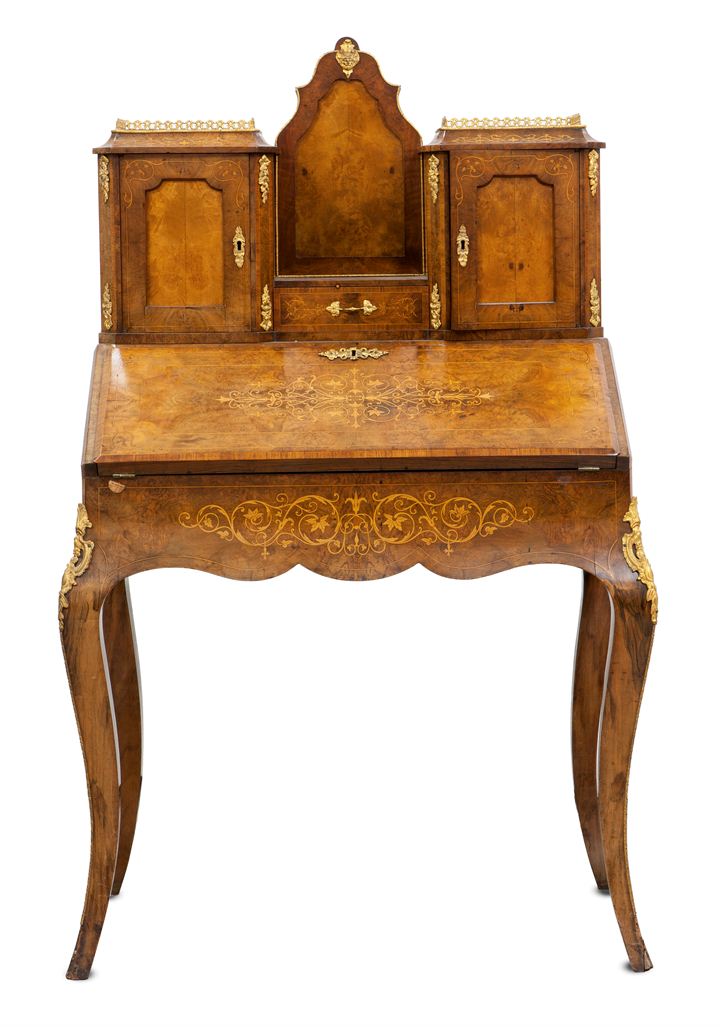 Ribaltina da centro, di gusto francese, a due corpi, lastronata in radica di noce ed intarsiata in acero a motivi vegetali, decorata con bronzi cesellati e dorati. Nella parte inferiore, la calatoia cela tre tiretti, vani ed un segreto; interno lastronato in palissandro; scrittoio in pelle. Gambe alte.