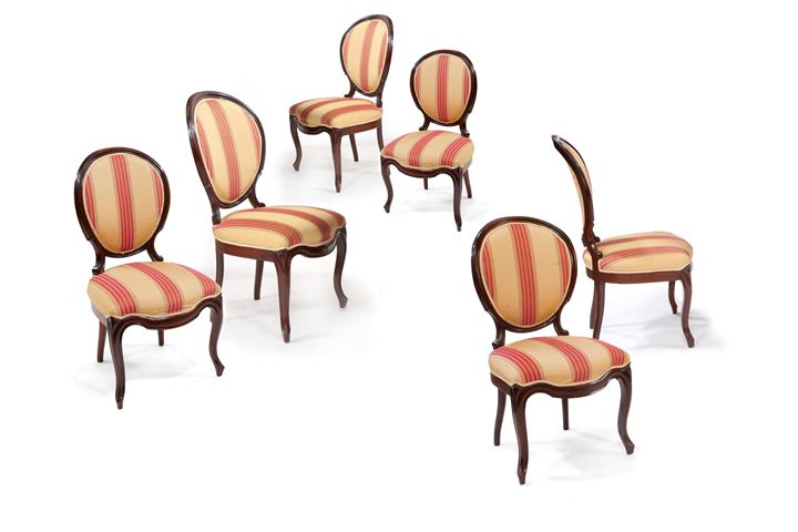 Lotto 567 | SEI SEDIE Sei sedie in mogano rivestite in tessuto a righe. cm 91x50x47