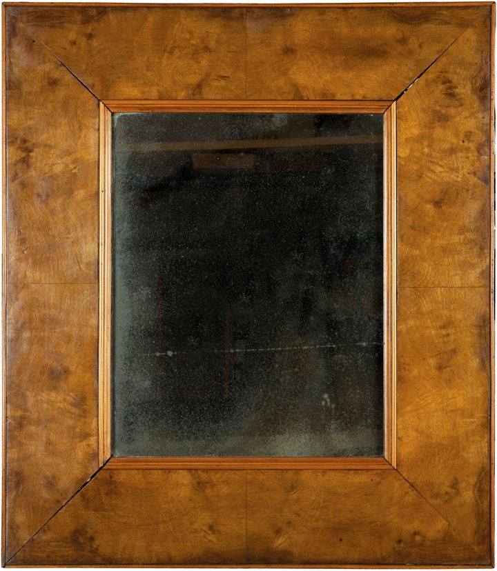 Vecchia specchiera con cornice lastronata in noce, specchio argentato al mercurio