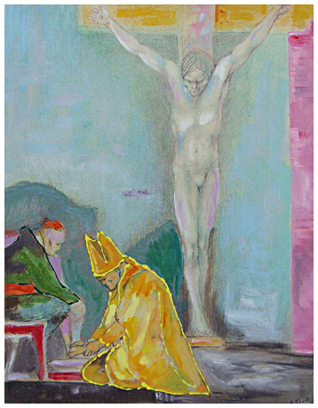 UGO ATTARDI Sori 1923 – Roma 2006 Giovanni Paolo II° lava i piedi a un cardinale dinanzi al crocifisso 2002 Interventi a olio su serigrafia materica a 49 colori es.114/150 (44,5 x 34,5). Firma in b. a d. B.A.: A OFFERTA