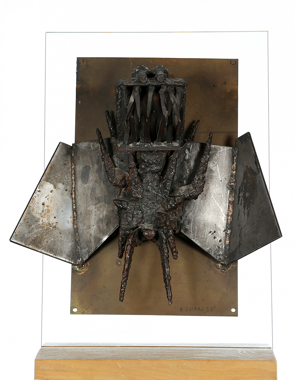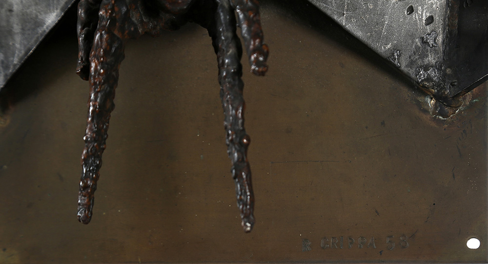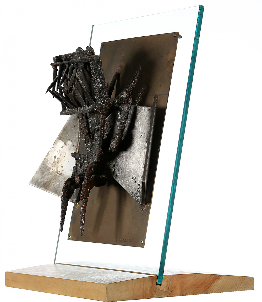 ROBERTO CRIPPA 1921 - 1972 Scultura spaziale, 1958 Scultura in ferro e metallo, cm. 41 x 41 con base in legno e supporto in vetro, cm. 54 x 41 x 34 Firmato e datato in basso a destra Etichetta Galleria d’Arte Bergamo, Bergamo Prov. Collezione Privata
