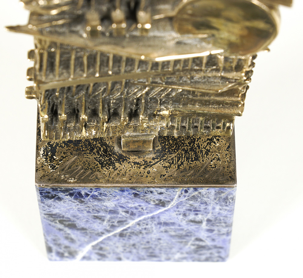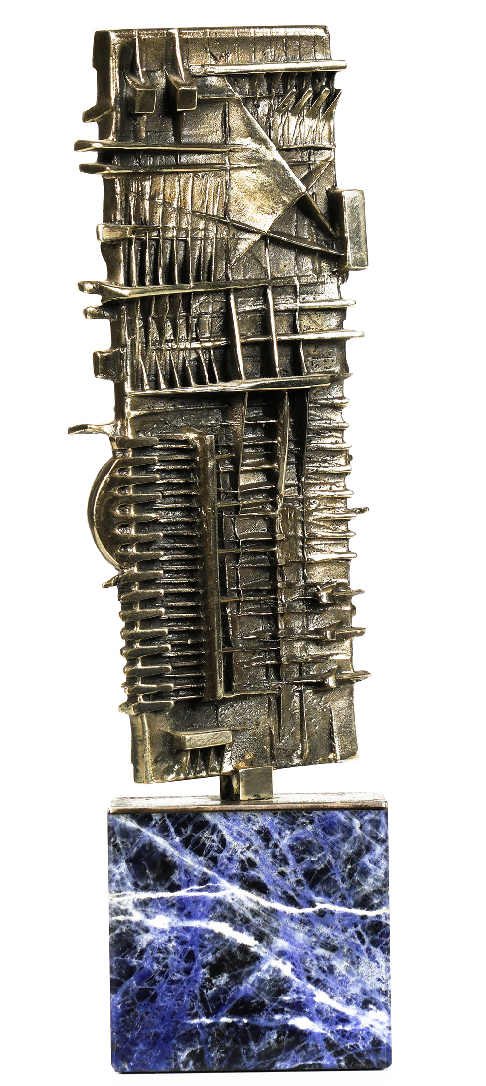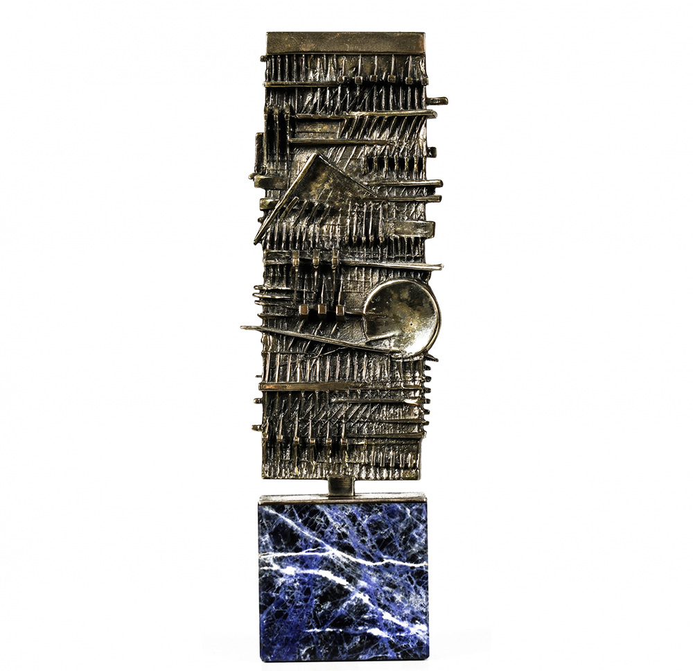 ARNALDO POMODORO 1926 Progetto, 1978 Multiplo, scultura in argento con base in sodalite, cm. 18 x 5 x 2,5, di cui base h. cm. 5 Tiratura a 90 esemplari arabi + 10 romani P.a., Firmato Certificato di Provenienza Ars d s.r.l., Milano Prov. Collezione Privata