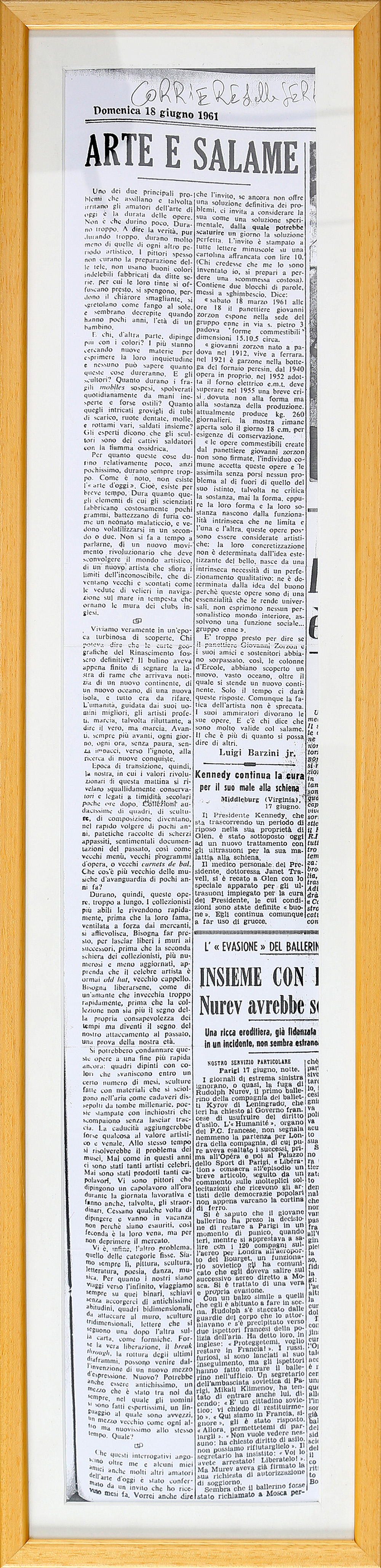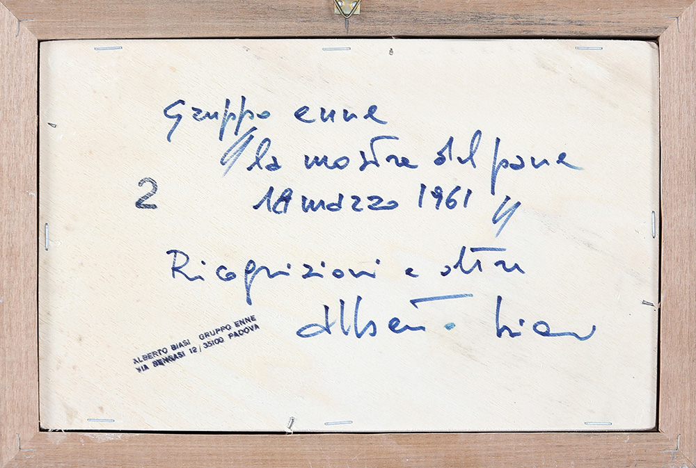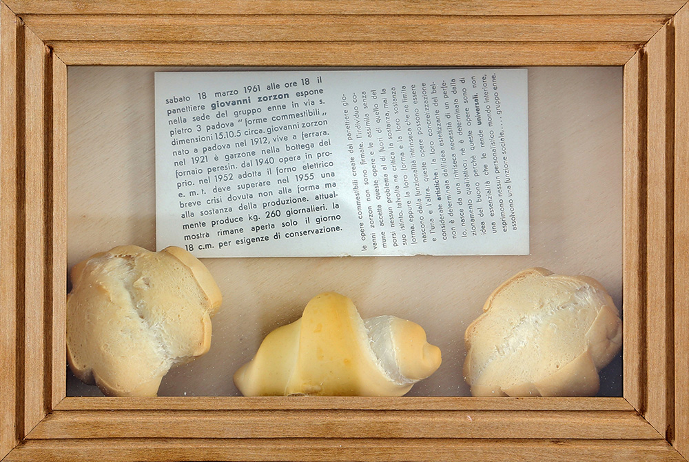ALBERTO BIASI 1937 La mostra del pane 18 marzo 1961, 1961 2 pezzi, assemblaggio di pane e riproduzione xerografica in box di legno e vetro, cm. 19 x 28,5 x 7 Stampa su carta, cm. 67,5 x 12 Firmato e datato sul retro, Timbro dell’artista sul retro ESPOSIZIONI : “La mostra del pane”, Studio N,1961 BIBLIOGRAFIA :“Vaf Stiftung. La Collezione. Catalogo Generale”, Silvana Editoriale, 2012, p. 423 Prov. Collezione Vaf Stiftung, Francoforte Prov. Collezione Privata