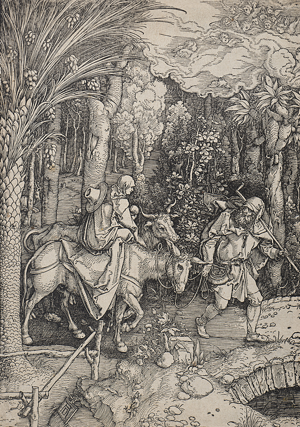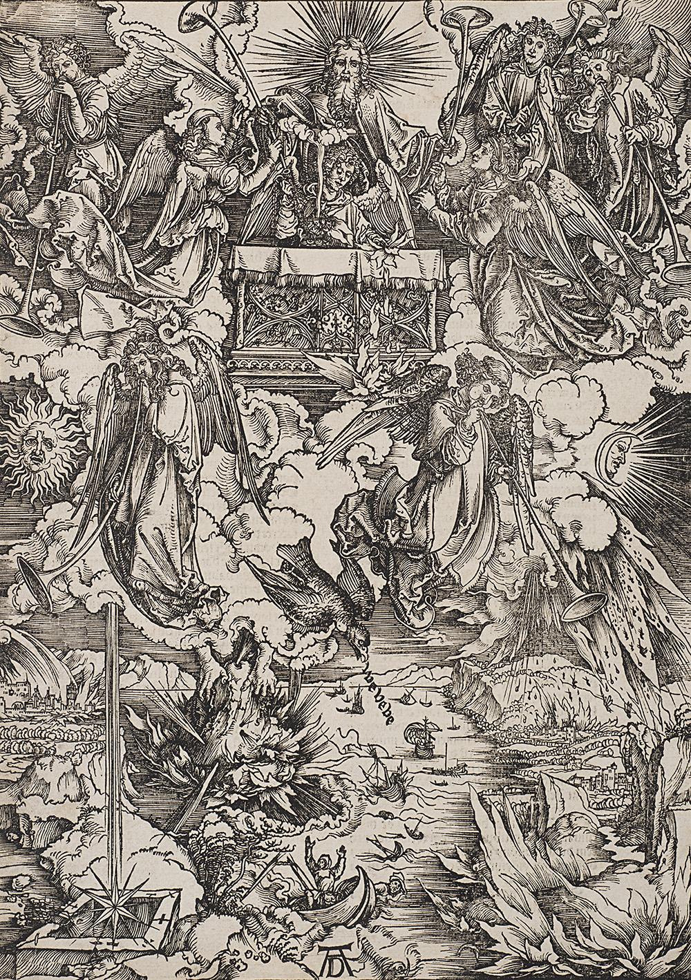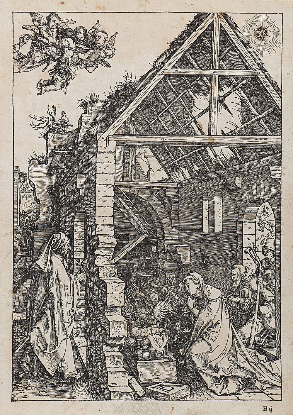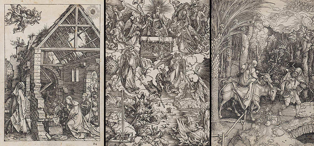 Lot composed of three woodcuts by Albrecht Durer (Nuremberg 1471-1528) depicting "The nativity of Christ" and "The flight into Egypt" (from "The life of the Virgin") and "The seven trumpets" (from "The Apocalypse"), different editions