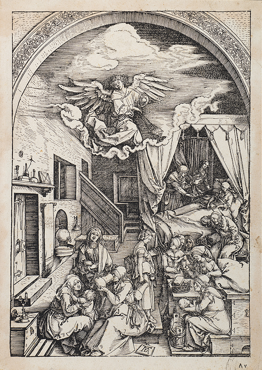 Lotto composto da tre xilografie di Albrecht Durer (Norimberga 1471-1528) raffiguranti "La nascita della Vergine", "La presentazione di Cristo al tempio" e "L'assunzione e l'incoronazione della Vergine" (dalla serie "La vita della Vergine"), edizioni differenti
