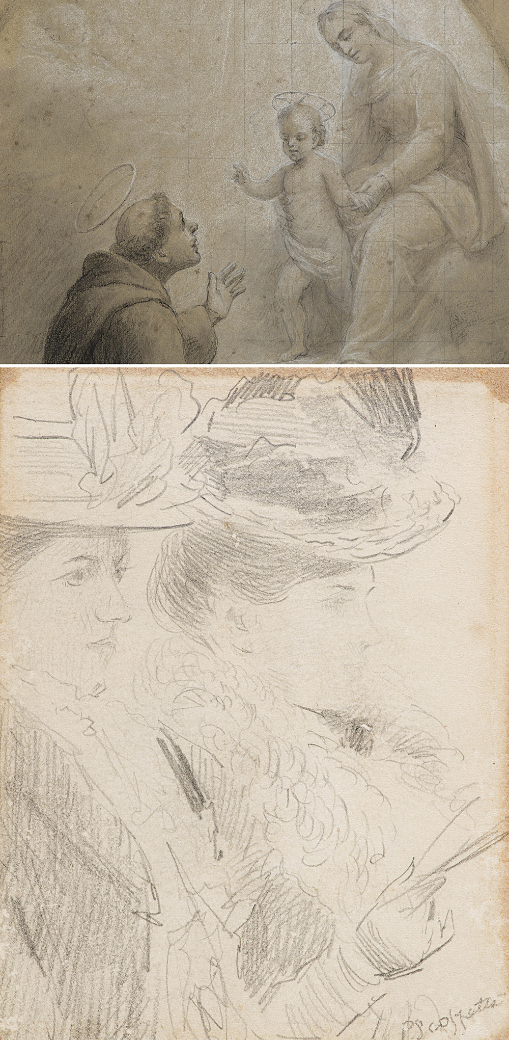 Lotto composto da due disegni: "Studio di figure femminili" attribuito a Pietro Scoppetta ed un disegno del secolo XVII raffigurante "Santo in adorazione della Vergine con Bambino".