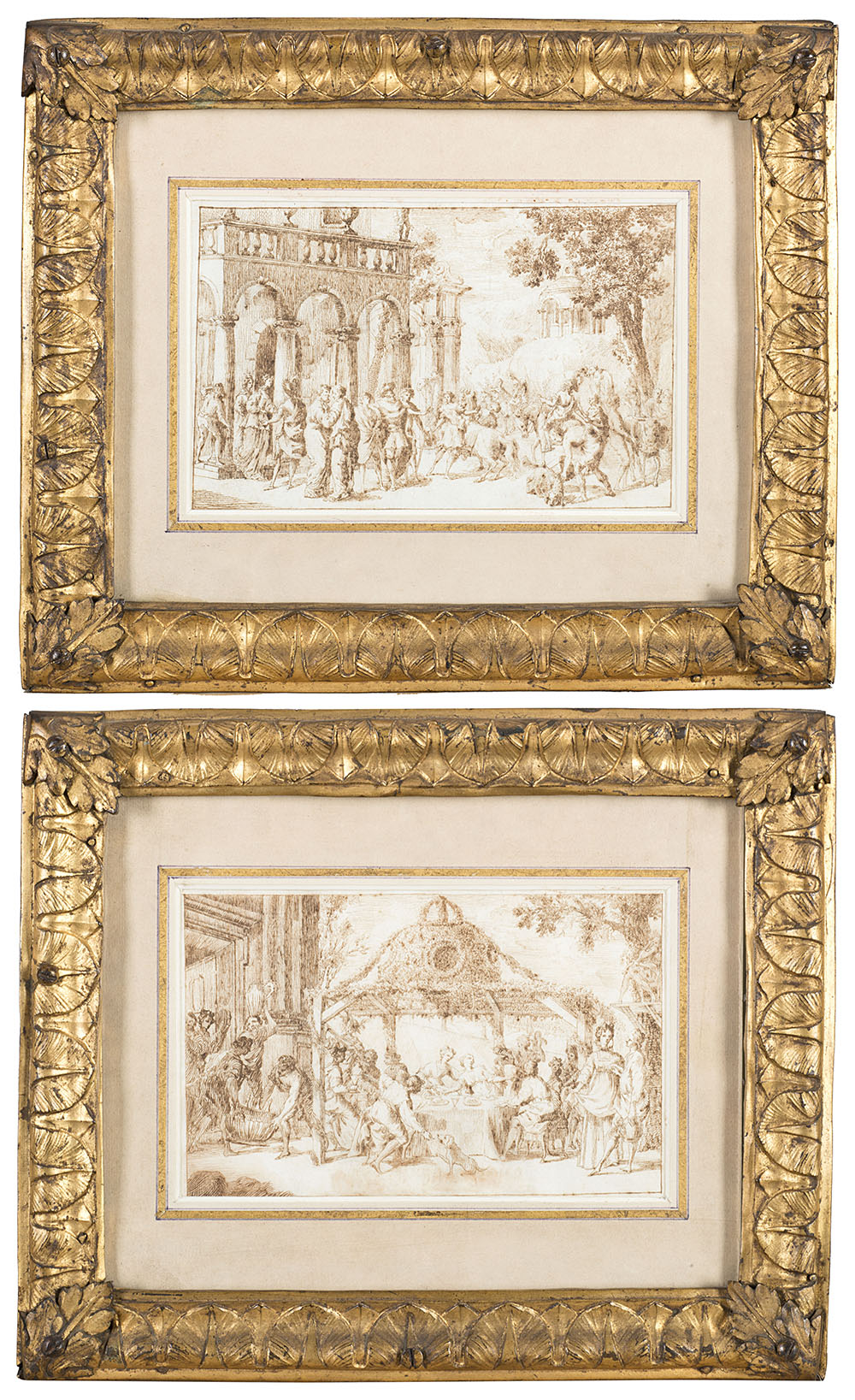 Scuola del secolo XVIIDue disegni raffiguranti "Incontro a palazzo" e "Scena...