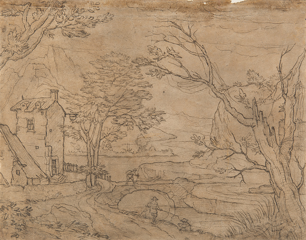 Scuola nord europea del secolo XVIIIPescatori in un paesaggio con ponteMatita...