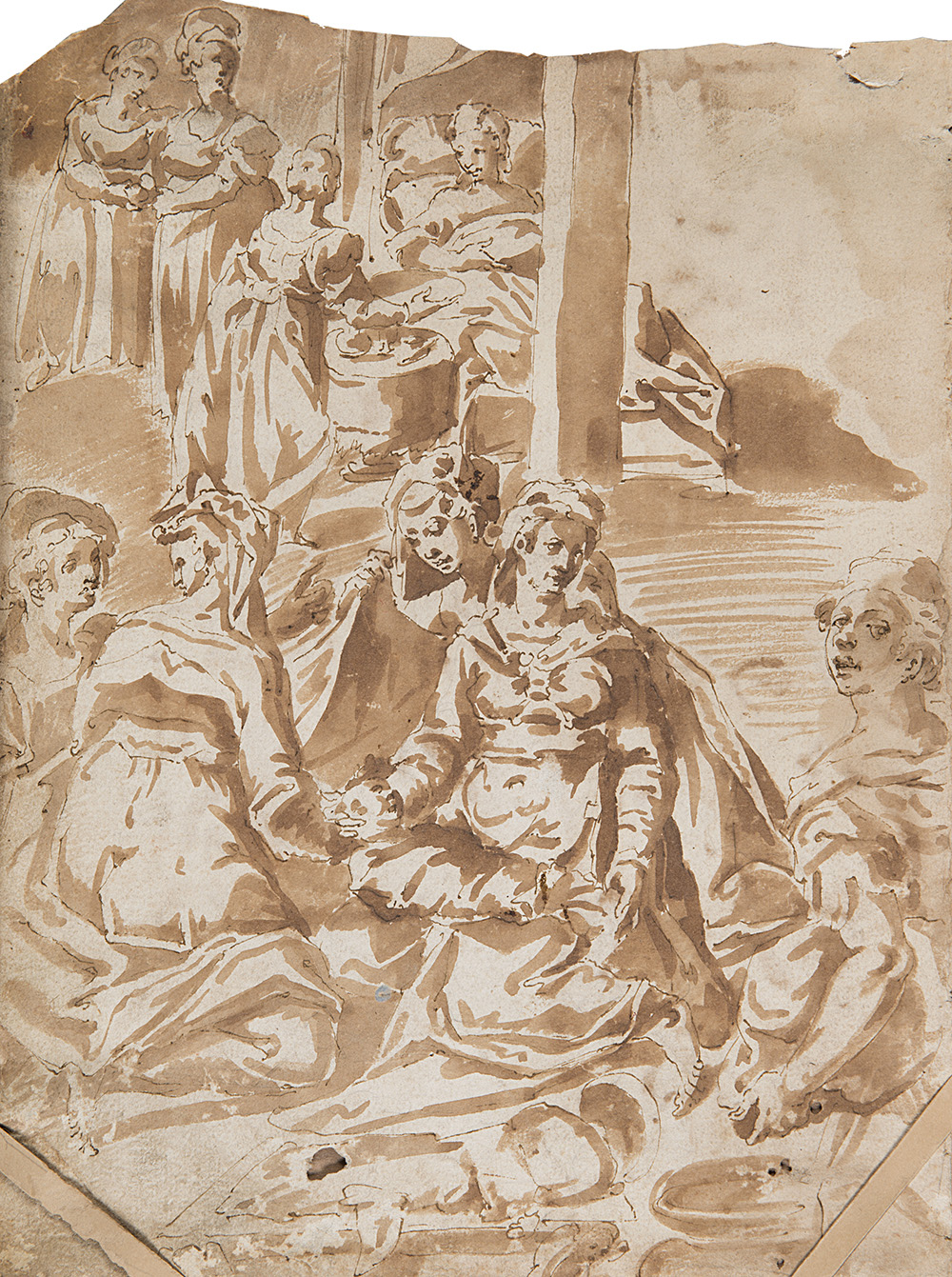 Studi di decorazione, con applicato un piccolo schizzo a penna (recto); Nascita della Vergine (verso)