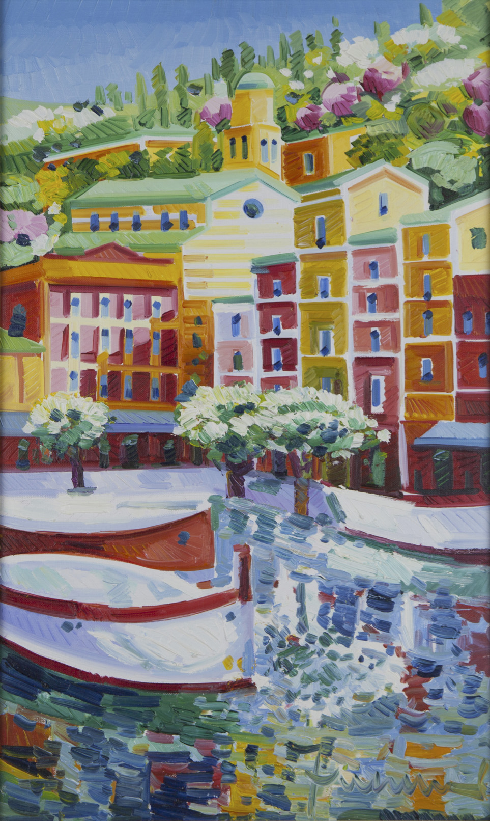 Athos Faccincani Peschiera del Garda 1951 "Scorcio di Portofino" anno 2017 olio su tela cm 50x30 Firmato in basso a destra; al retro titolo e firma Autentica rilasciata dal Maestro