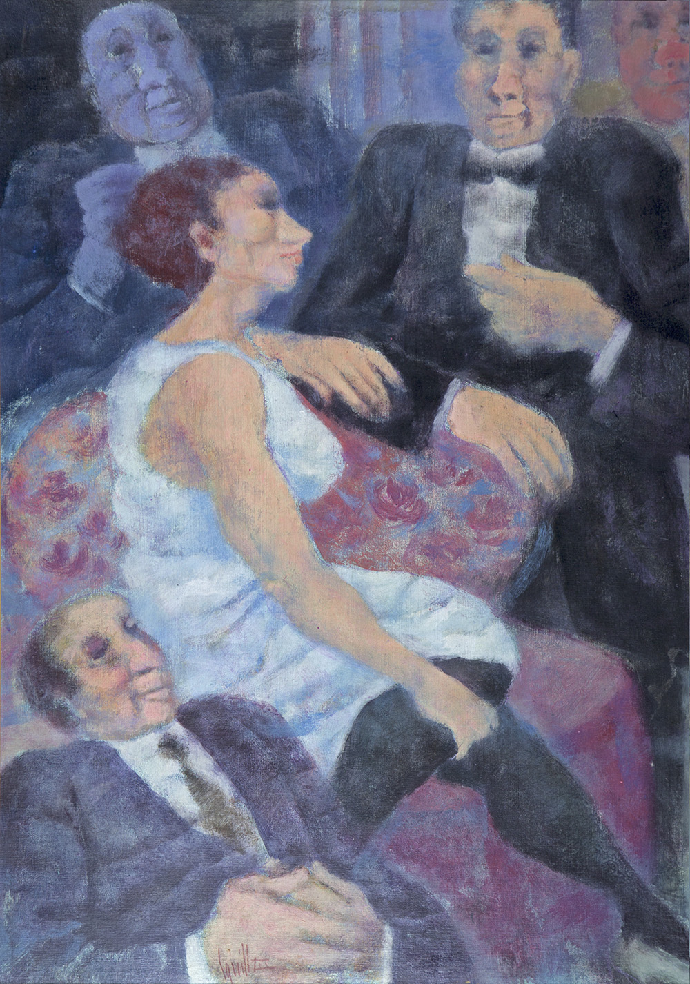 Remo Squillantini Stia 1920 – Firenze 1996 "Salotto" olio su tavola anno 1979 cm 70x50 firmato in basso al centro; al retro firma + Autentica con Archivio di Remo Squillantini