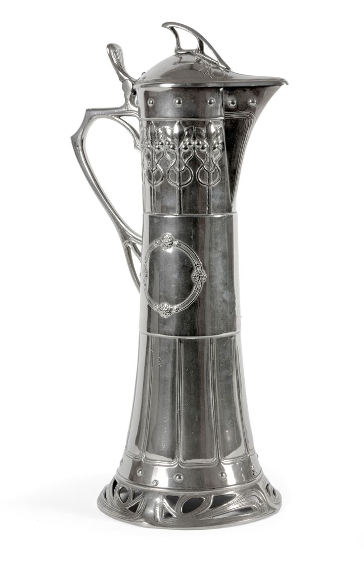 Grande caraffa, Germania inizi 1900, in metallo argentato decorato a motivi Liberty