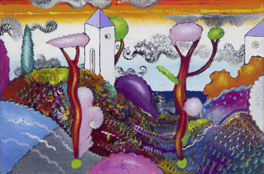 Luca Alinari Firenze 1943 " Rompicapi degli avverbi" acrilico su stoffa su tavola cm 20x30 firmato in basso al centro; al retro etichetta Galleria Immagine - Bari Autentica rilasciata da Luca Alinari + foto Maestro con opera