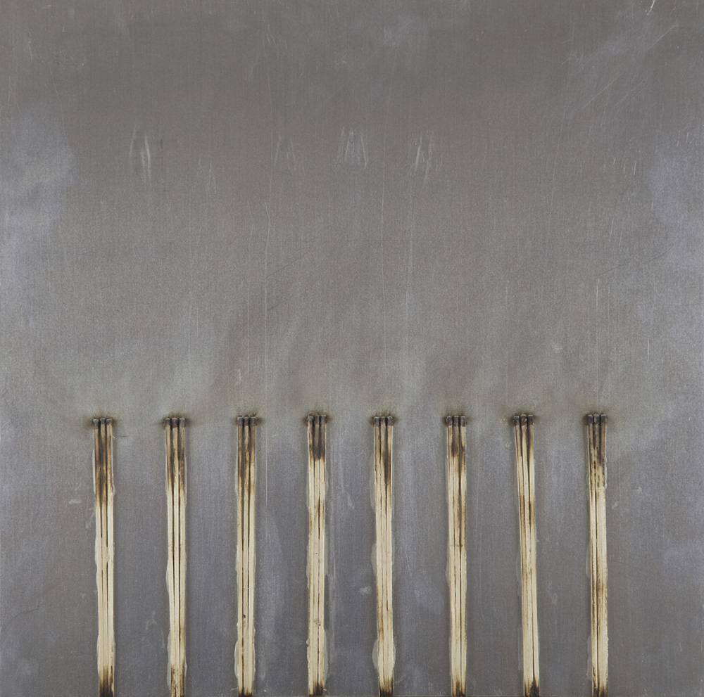 Bernard Aubertin Fontenay-aux-Roses 1934 - Reutlingen 2015 "Dessin de feu" fiammiferi bruciati su metallo anno 2010 cm 50x50 firmato e datato al retro Archivio Opere Bernard Aubertin su fotografia