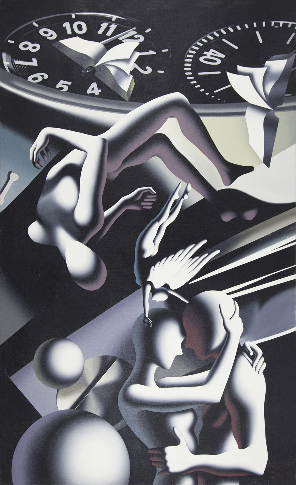 Mark Kostabi Los Angeles 1960 "Second change" olio su tela cm 130x79 Firmato e datato 2007 in basso a destra al retro titolato, firmato, datato 2009 (diversion) e dimensioni Autentica rilasciata dal Maestro