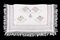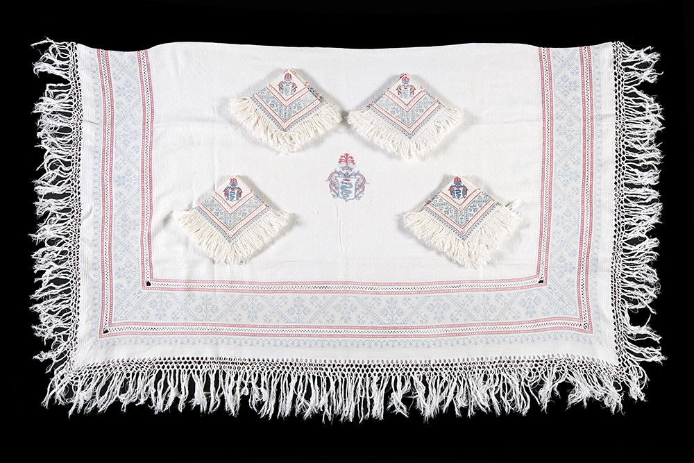 Tovaglia in lino bianco operato, decorata con stemma visconteo in azzurro, rosso e frange. Corredata di diciotto tovagliolini ricamati con stemma visconteo in azzurro e rosso, secolo XX.