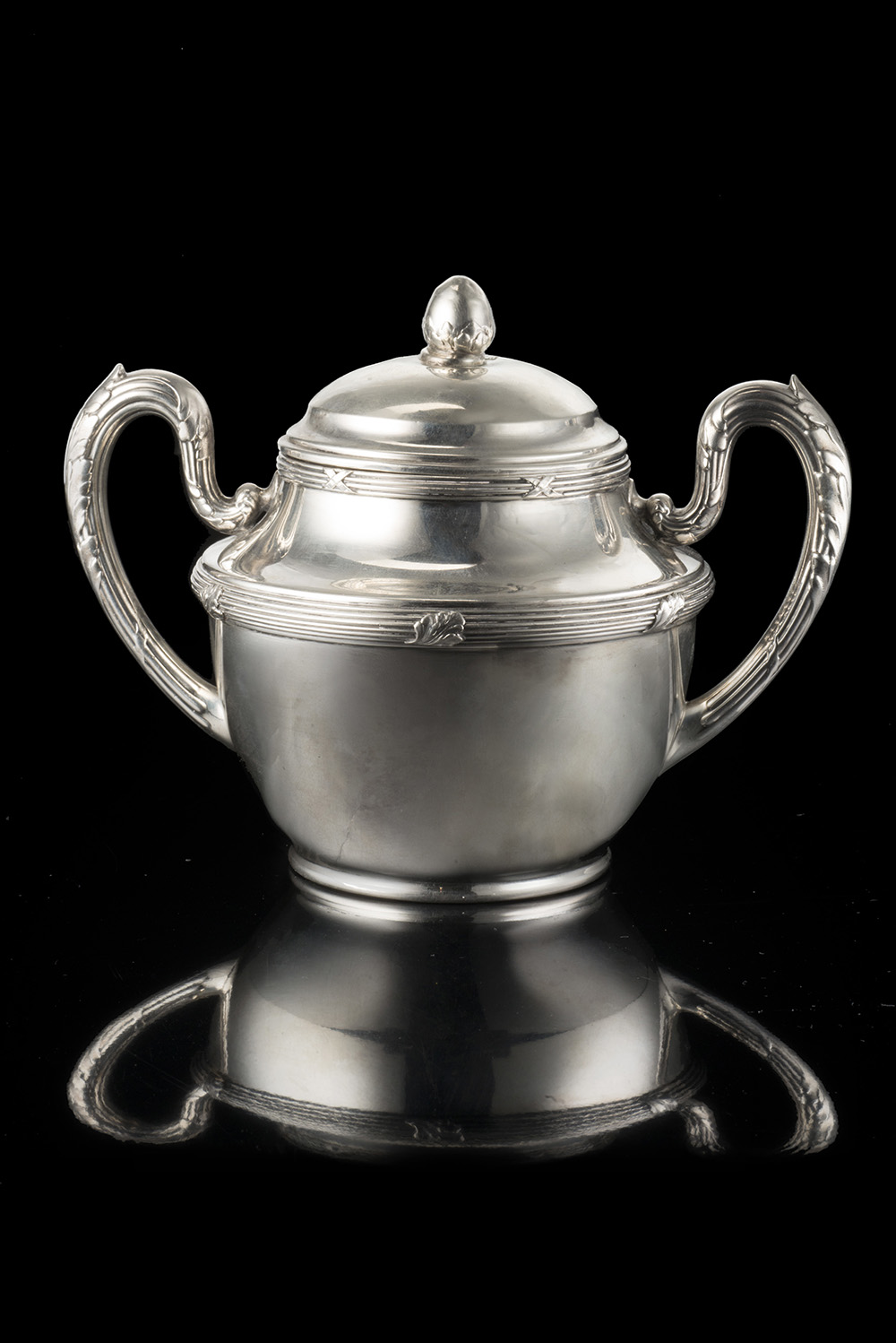 Zuccheriera biansata in argento con corpo a balaustro liscio decorata da cinture di fasci, nastri intrecciati e rilievi fogliati. Italia, inizi del secolo XX (h. cm 12x16 ca.) (g 290 ca.) (difetti)