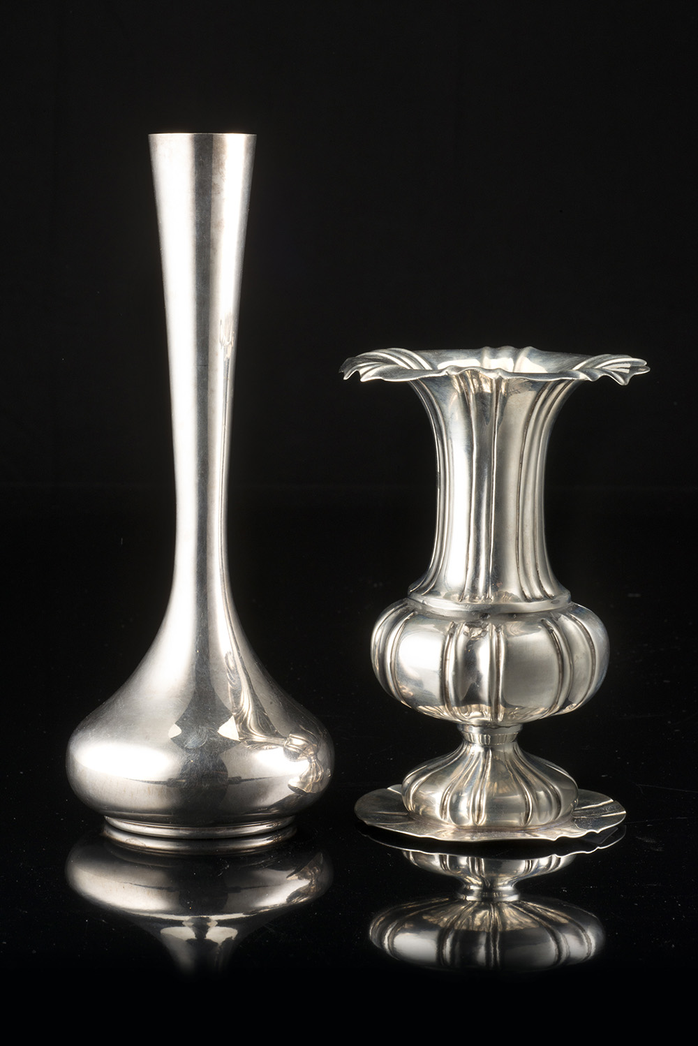 Lotto in argento composto da due vasi di cui uno liscio ad ampolla ed uno con corpo a balaustro a scanalature verticali. Italia, secolo XX (h. max cm 21,5 ca.) (g tot 330 ca.) (lievi difetti)