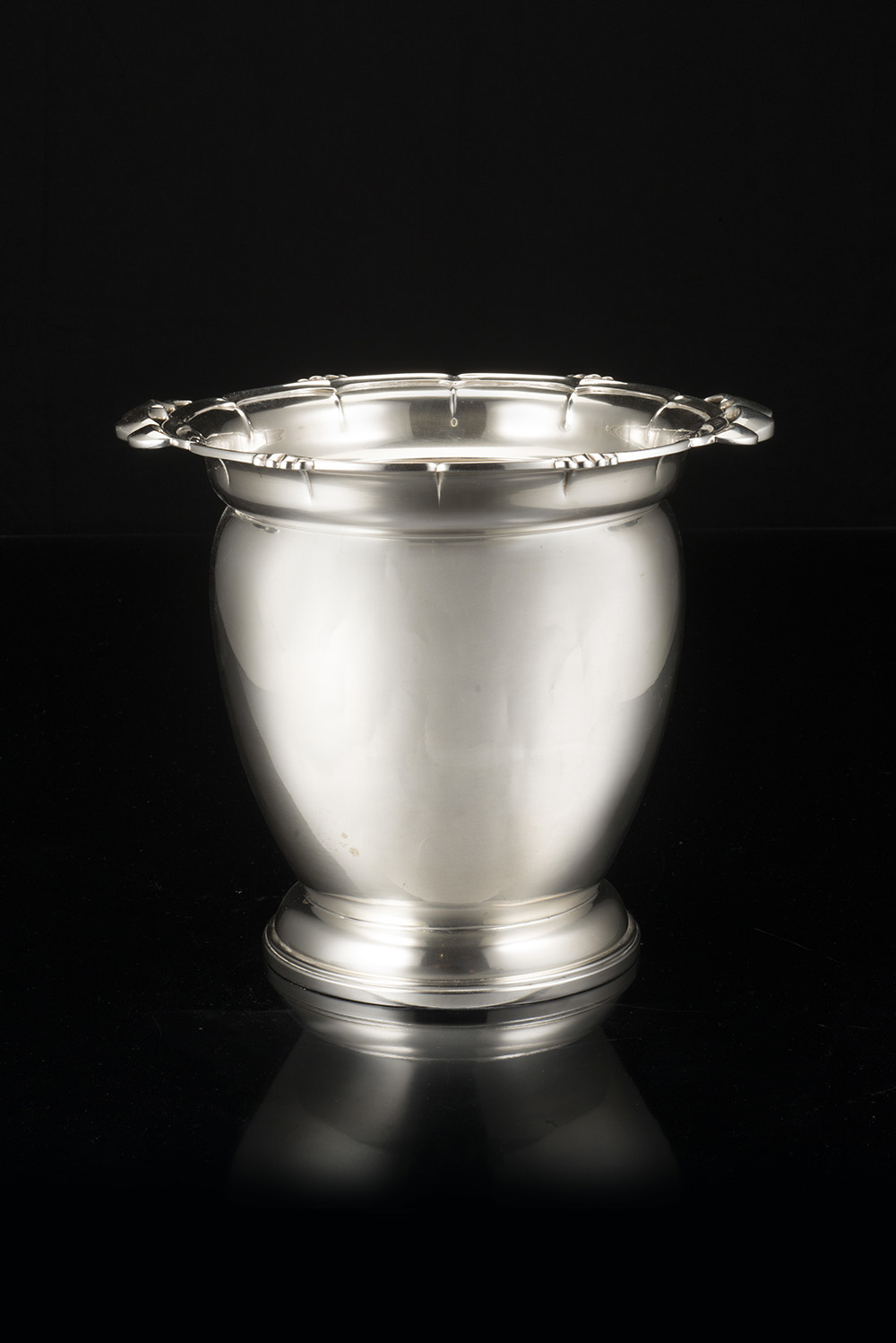 Secchiello portaghiaccio per Champagne in argento con corpo a balaustro liscio, bordo sagomato, nervato e modanato, con prese a fascia ondulata. Milano, anni '30/'40. Argentiere F.lli Broggi. Marchio del Fascio (h. cm 22x26,5 ca.) (g 1230 ca.) (lievi difetti)