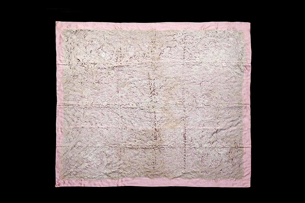 Pink silk bedspread with applied lace, 18th century (cm 250x230) (defects)