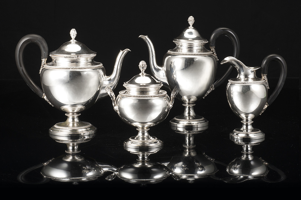 Servizio da tè e caffè in argento composto da caffettiera, teiera, lattiera e zuccheriera con corpi di forma ovoidale a superficie liscia decorata da cinture perlinate; cimature a bocciolo e manici ad ansa in legno ebanizzato con attacchi fogliati. Italia, prima metà del secolo XX. Marcato Miracoli (h. max cm 20 ca.) (g lordi tot 1340 ca.) (lievi difetti)