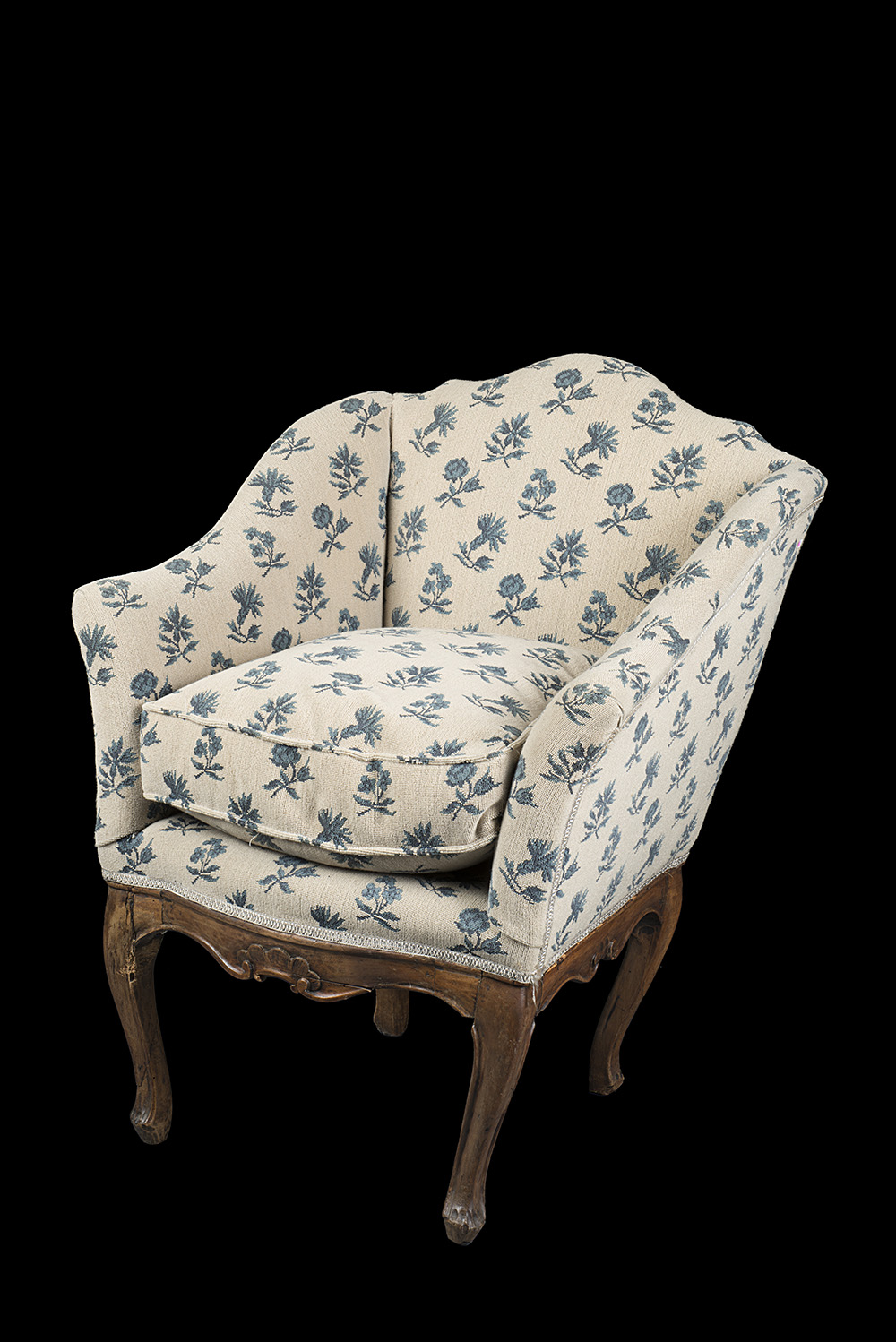 Poltrona a pozzetto in noce con gambe a fasce mosse e intagliate a motivi floreali. Secolo XVIII (difetti)