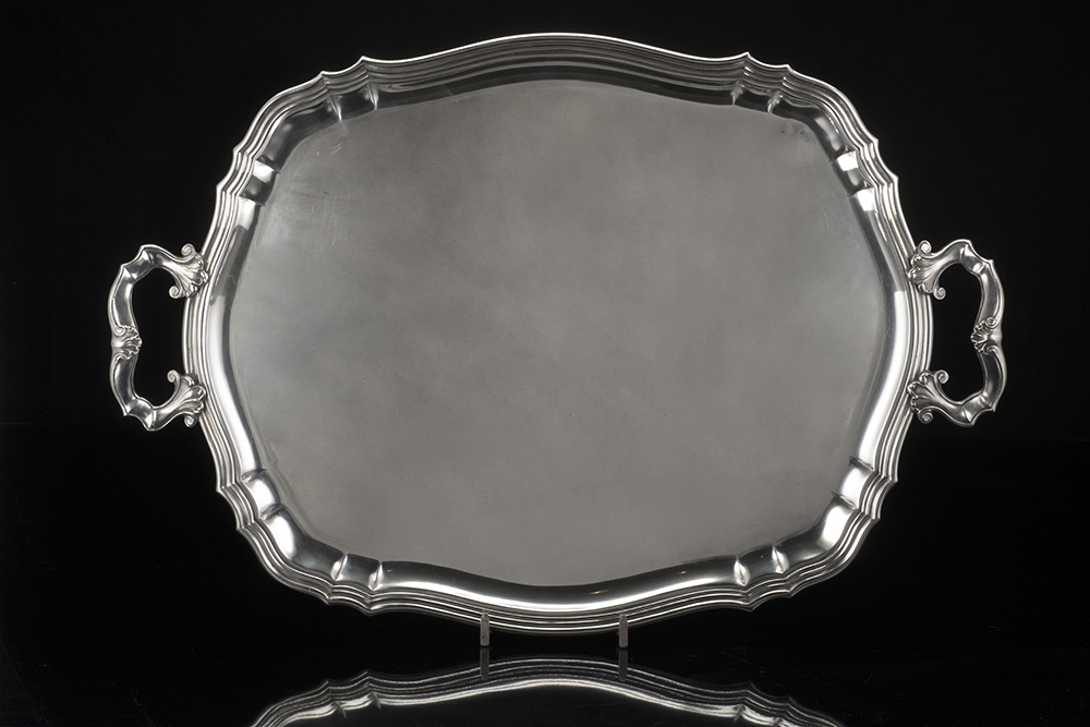 Vassoio in argento a due manici di forma rettangolare mistilinea, con cavetto nervato e bordura modanata; manici con attacchi e fermagli fogliati. Italia, metà del secolo XX (l. max cm 65 ca.) (g 3020 ca.) (lievi difetti)