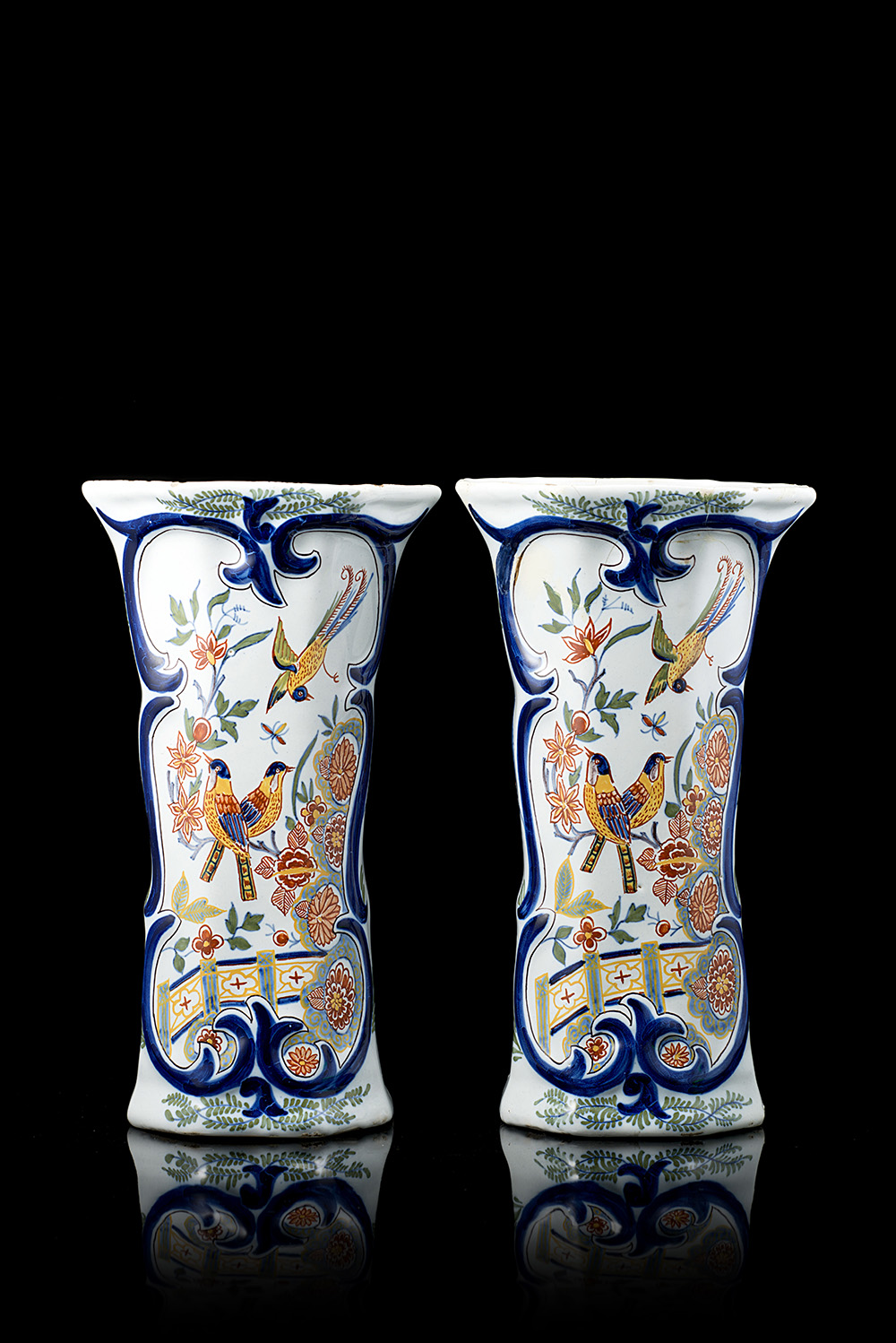 Manifattura di Delft, secolo XIX. Coppia di vasi in maiolica decorati a volatili e rami fioriti nello stile di Adriaen Kocks. Marcati alla base (h. cm 25) (restauri)