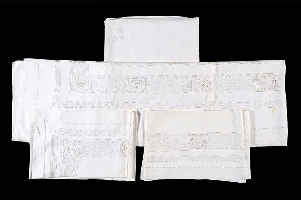 Double-bed sheet set decorated with lace strips embroidered with the Visconti family crest. 20th century (defects)