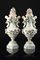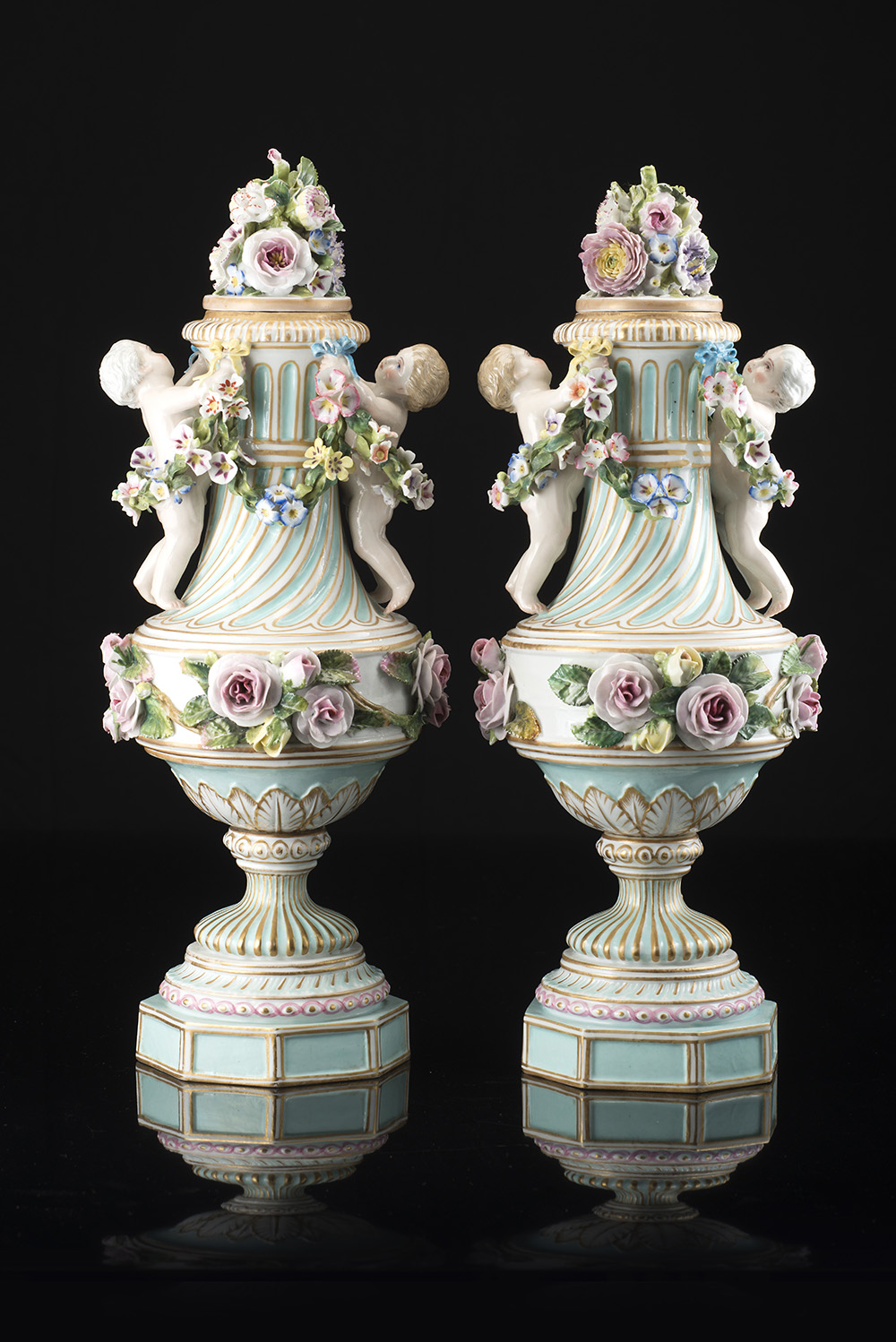 Manifattura di Meissen, secolo XX. Coppia di vasi in porcellana decorati in policromia in rilievo a putti che sorreggono ghirlande floreali. Base ottagonale (h. cm 43) (mancanze)