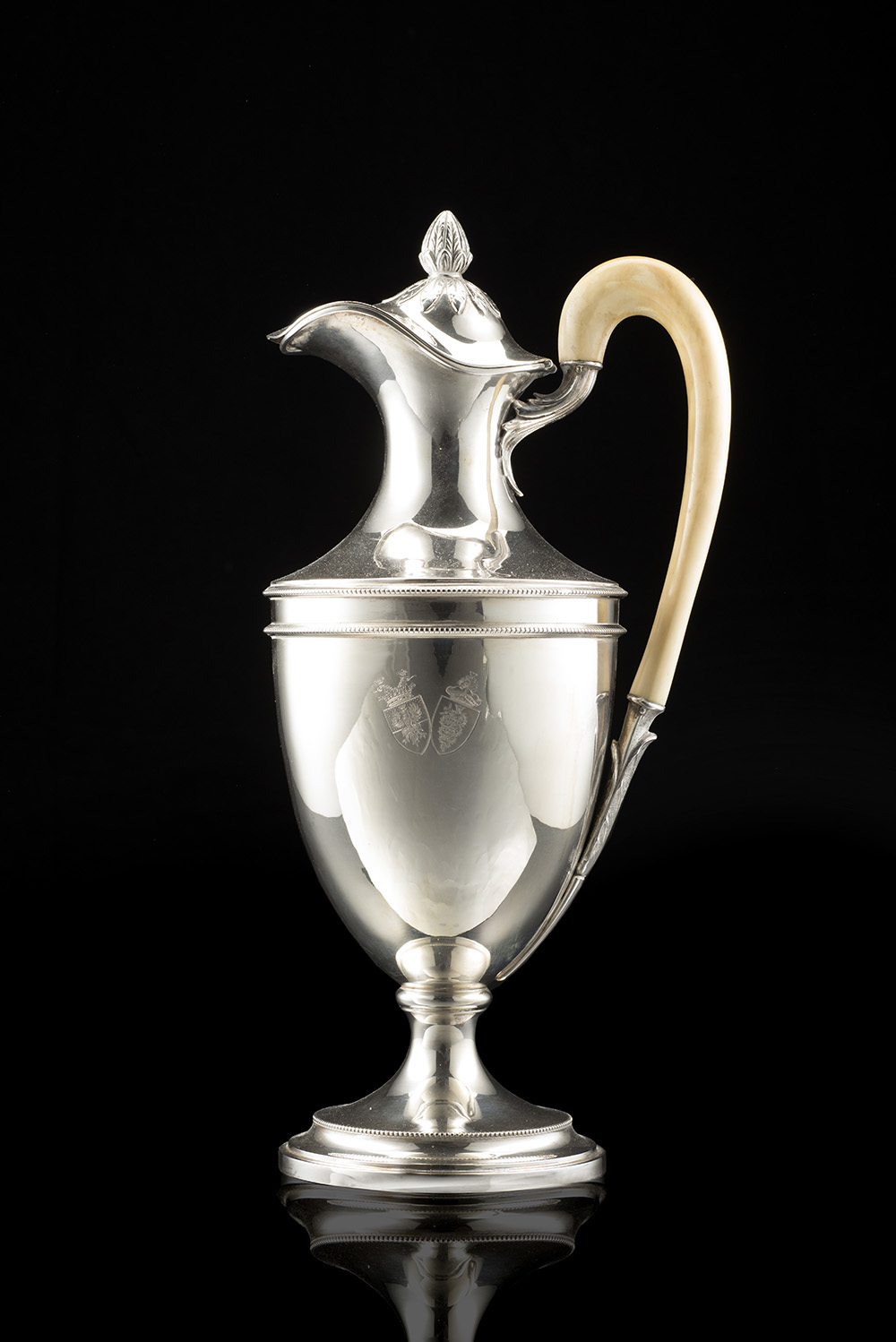 Caffettiera in argento con corpo ogivale a spalla angolare, su piede circolare rastremato, decorata da cinture perlinate; bocca e coperchio sagomati con cimatura a tutto tondo in figura di pigna, e manico ad ansa coevo in avorio. Stemmi affiancati delle famiglie Doria e Visconti di Modrone incisi. Italia, prima metà del secolo XX. Marcata Miracoli (h. cm 33 ca.) (g 920 ca.) (lievi difetti)