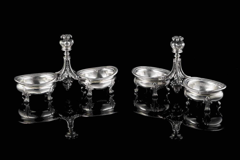 Coppia di saliere doppie in argento, con vaschette di forma ovale raccordate a presa verticale sagomata a tutto tondo in figura di festone di foglie e frutti. Francia, seconda metà secolo XIX, marcato Odiot à Paris (cm 21x12,5 ca.) (g 900 ca.); (contenitori interni in metallo argentato)(lievi difetti)