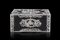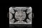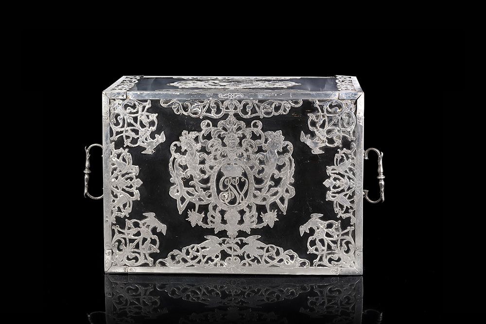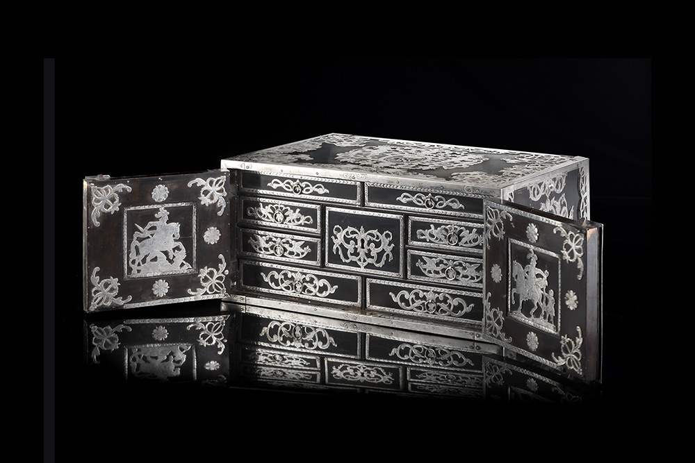 Monetiere da viaggio lastronato in legno ebanizzato interamente decorato da applicazioni in argento. Coperchio con corona del Sacro Romano Impero e cifre "GSV" entro cornice incisa a mascheroni, motivi fogliati e volute. Fronte a due ante con figure alate e motivi vegetali celanti cassettini con decori ad animali fantastici e anelli. Sportelli interni con fregi raffiguranti i santi Martino e Giorgio. Fianchi con maniglie e applicazioni decorate ad aquila ad ali spiegate su fuoco e con allegoria della Carità Cristiana. Al retro riserva con cavaliere con borgognotta che si dirige verso un fuoco. Ambito tedesco, fine secolo XVII (cm 42x20x30) Etichetta "Nobile Casa Viden" sotto la base (difetti)