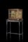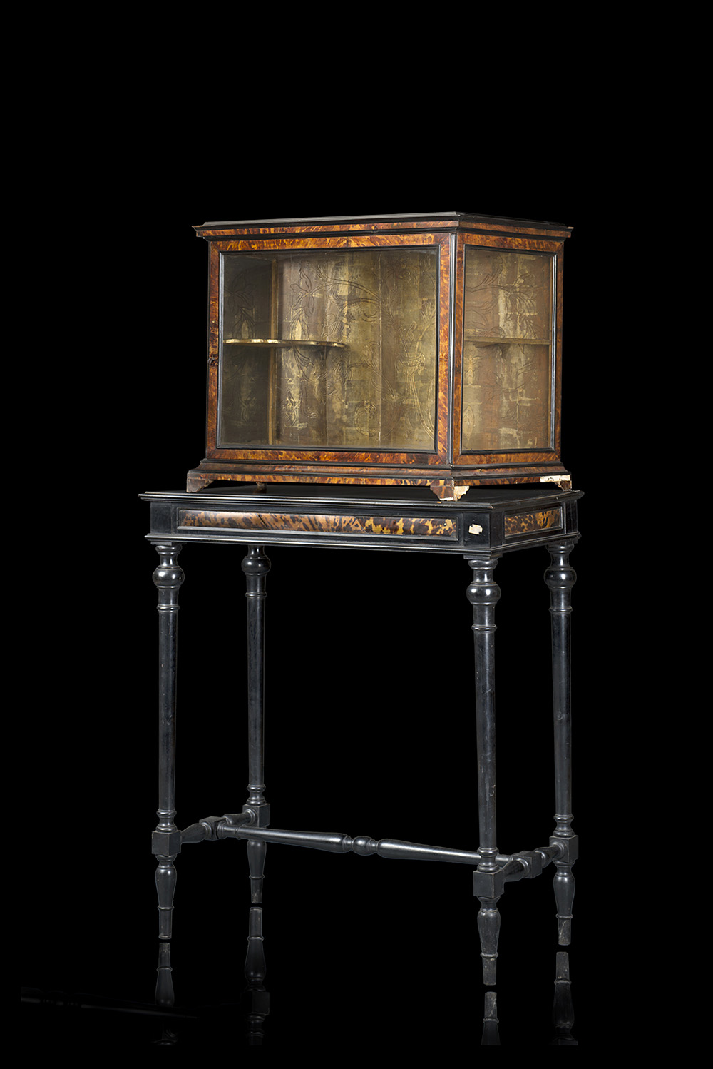 Teca lastronata in tartaruga con profili ebanizzati, fronte e fianchi a vetri, interno dorato inciso a girali di foglie e fiori. Sicilia, secolo XIX. Poggiante su base di epoca posteriore in legno ebanizzato con quadrature lastronate in tartaruga, gambe tornite riunite da traversa (cm 93x164x45,5) (difetti e mancanze)