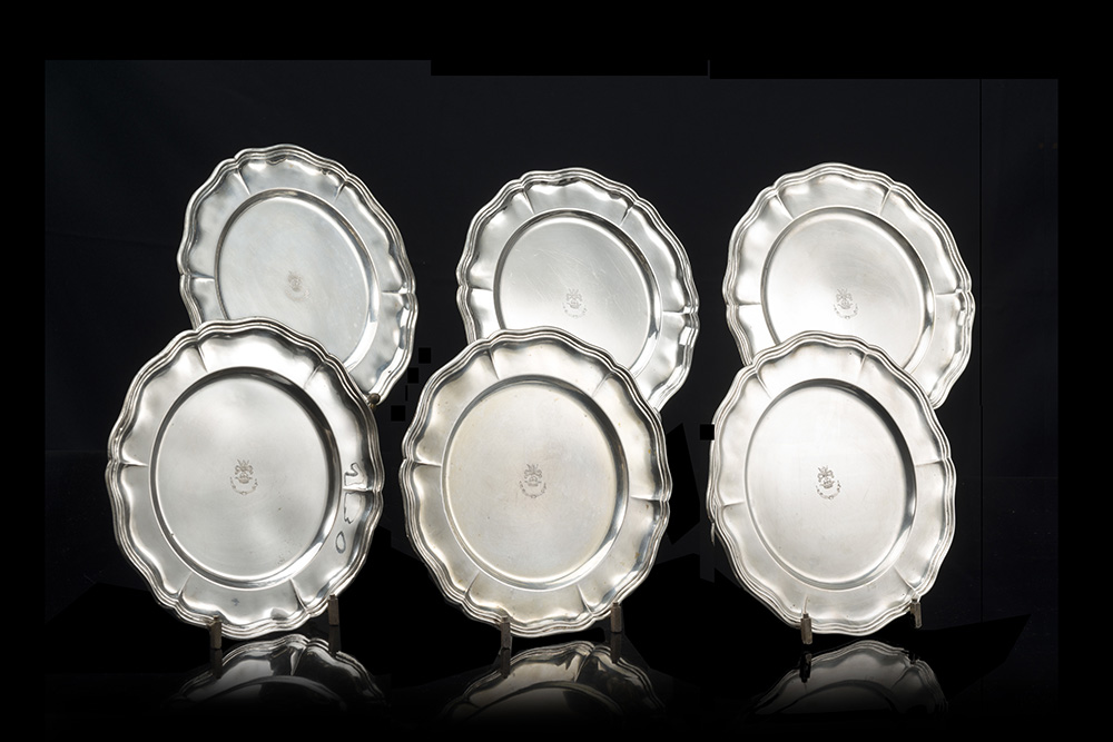 Sei sottopiatti in argento di forma circolare sagomata e fondo inciso con stemma, motto 'Pugnanti Virtute' e corona di marchesato. Italia, inizi secolo XX (d. cm 24 ca.) (g tot. 2230 ca.) (lievi difetti)