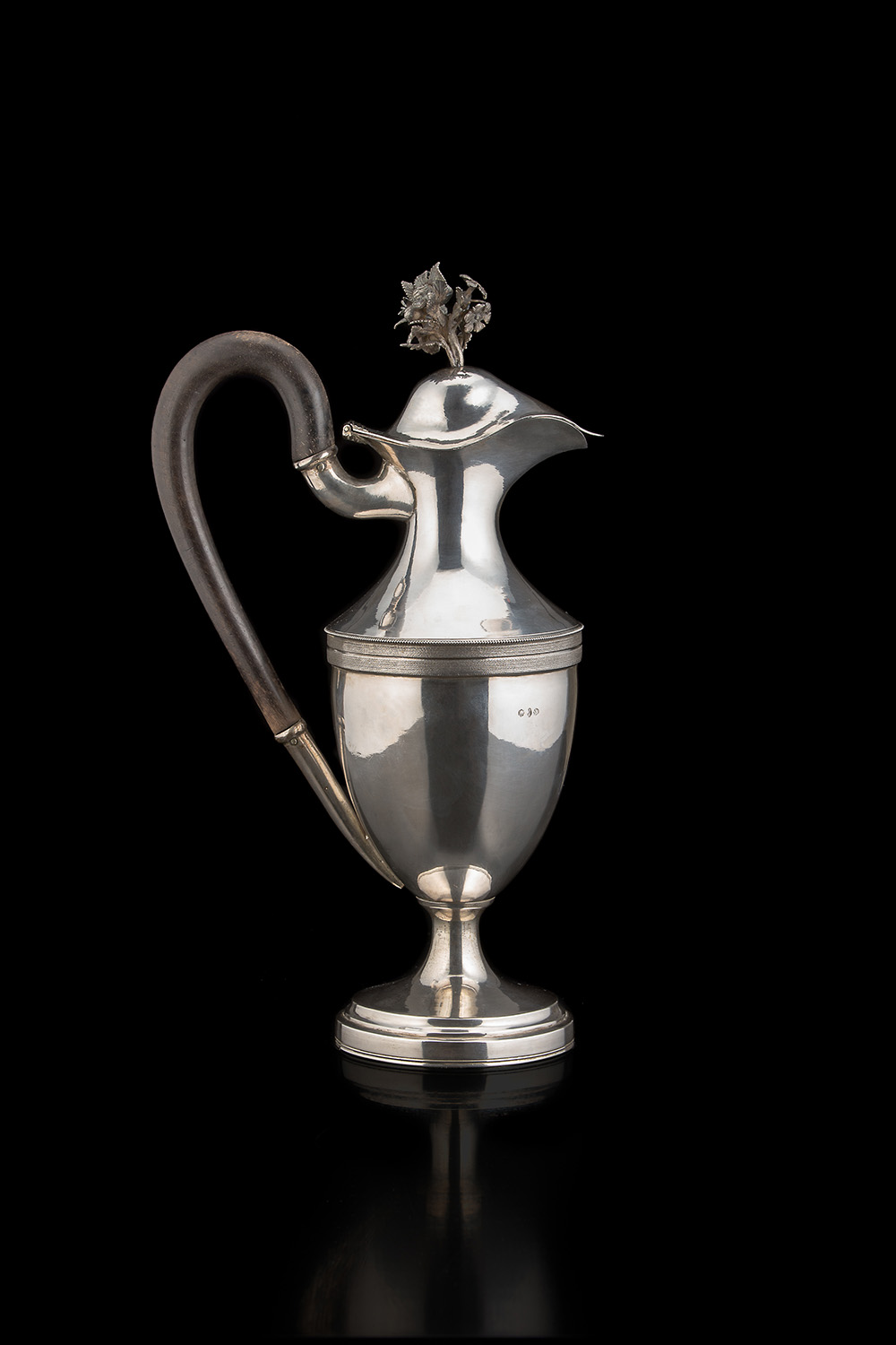 Caffettiera in argento con corpo ogivale a spalla angolare, su piede circolare rastremato, decorata da modanatura zigrinata; bocca sagomata e coperchio bombato con cimatura a tutto tondo in figura di bouquet di fiori; manico ad ansa in legno ebanizzato. Probabile manifattura tedesca della fine del secolo XVIII. Marchiatura non pertinente (h. cm 38,5 ca.) (g lordi 1410 ca.) (lievi difetti)
