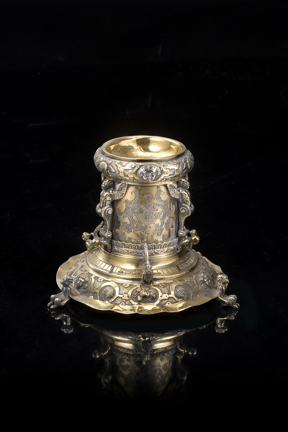 Saliera in argento dorato di forma cilindrica su base circolare tripode, decorata nello stile ‘alla Bérain’, con fasce sbalzate a mascheroni, motivi floreali e nastri intrecciati, ed applicazioni di figure zoomorfe. Area germanica, secolo XIX (h. cm 10 ca.) (g 260 ca.)