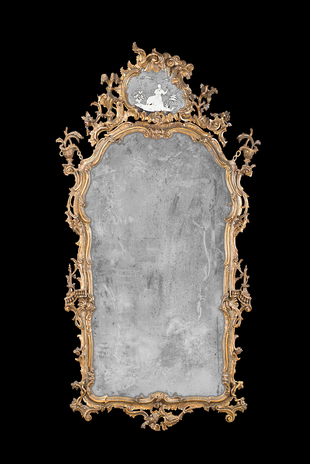 Specchiera di forma mossa in legno traforato, intagliato e dorato. Pendenti a girali di foglie terminanti con due vasi stilizzati, cimasa traforata centrata da cartella con vetro inciso. Venezia, prima metà secolo XIX (cm 217x118) (difetti e mancanze)