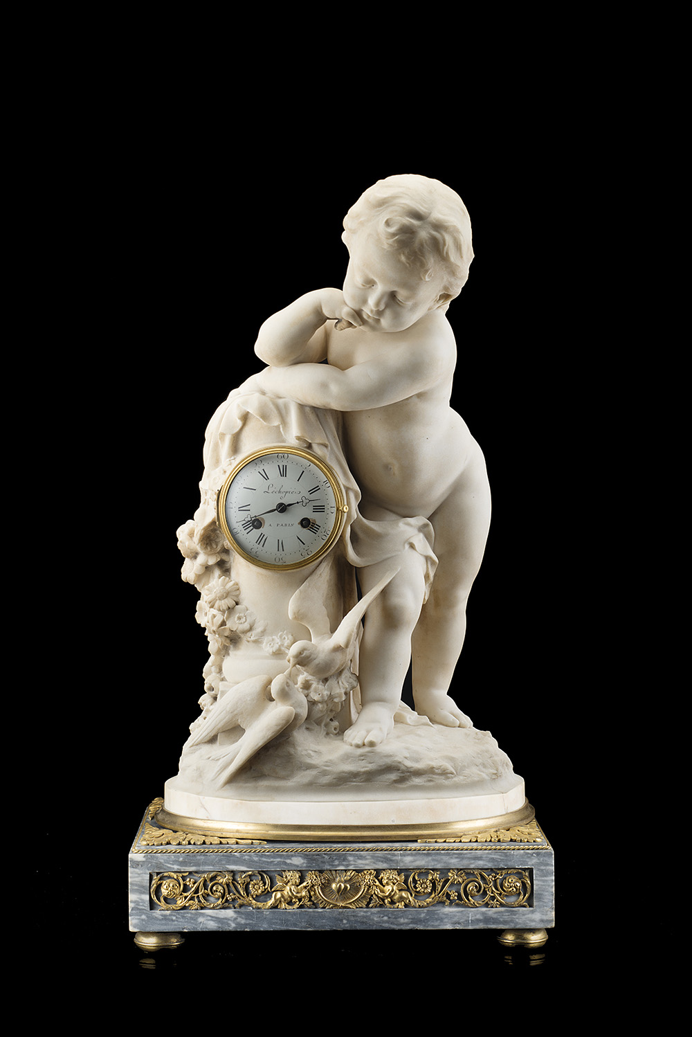 Orologio da appoggio con cassa in marmo scolpito a tutto tondo a figura di putto con festoni e rondini. Base in marmo grigio decorata a fregi in bronzo dorato, cesellato e traforato a volute fogliate e fiori.
