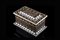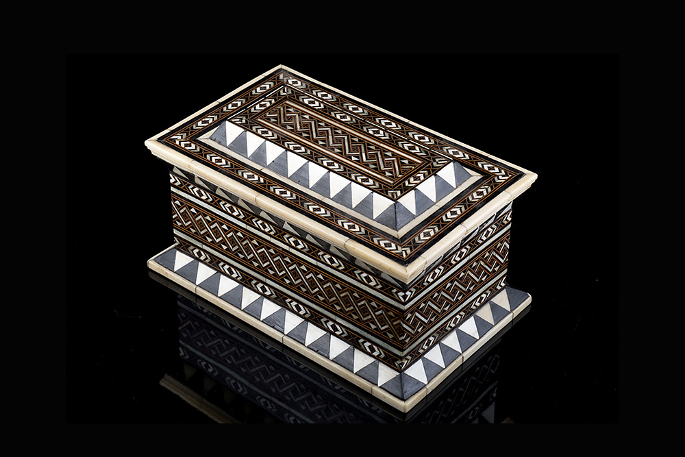 Cofanetto intarsiato in osso, madreperla e legni vari a motivi geometrici. Italia centrale, secolo XVIII (cm 26x12x16) (difetti)