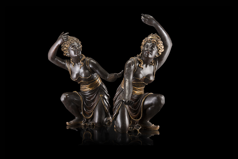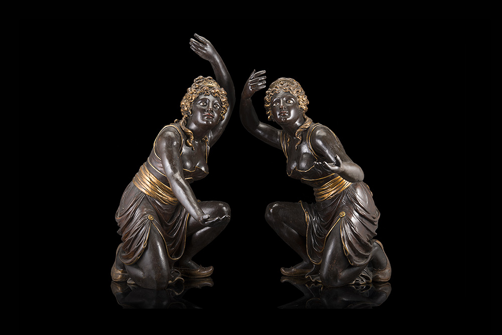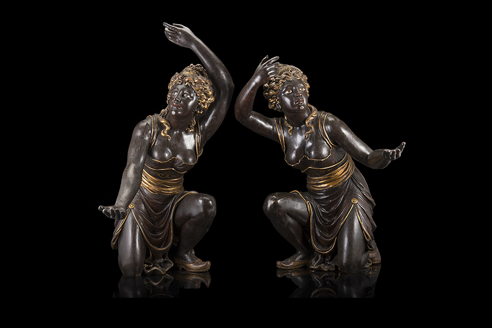* Due sculture in legno laccato e dorato raffigurate in ginocchio, in abiti riccamente scolpiti. Occhi in vetro. Venezia, secolo XIX (h. cm 88 e cm 76) (difetti)
