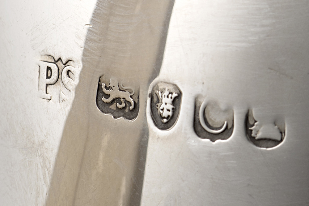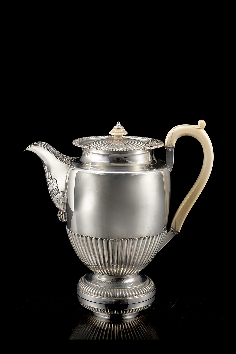 Caffettiera in argento, con corpo ad urna, decorato a fasce baccellate, beccuccio a mensola con foglie d'acanto e anthemion; ansa in avorio. Arme incisa di Blackwall. Londra, 1818, Paul Storr of Storr & Co (h. cm 20) (g 910 ca.) (lievi difetti)
